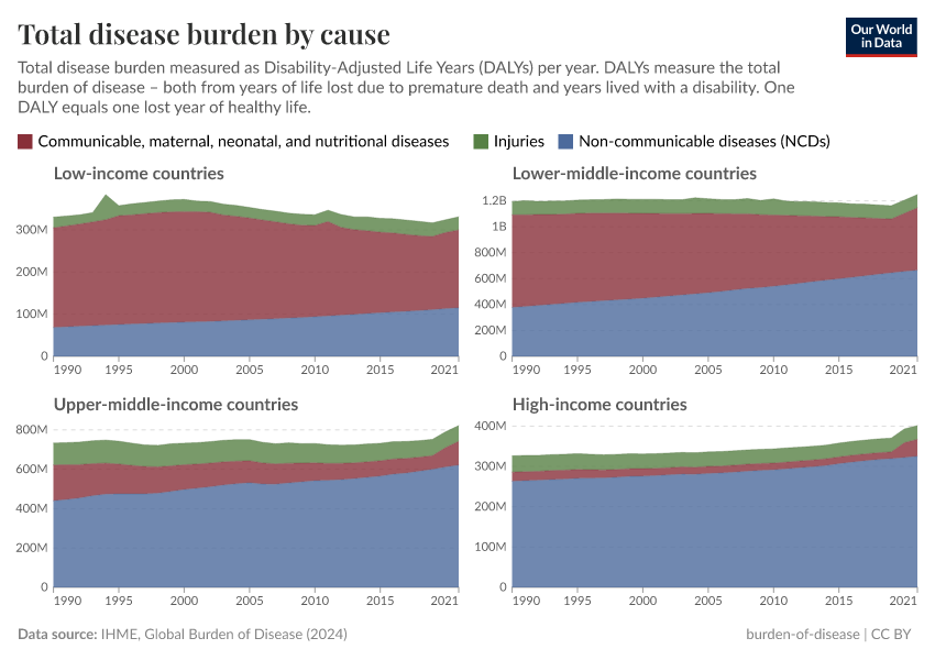 In low-income countries, communicable and neonatal diseases tend to rank much higher. This starkly contrasts with high-income countries, where communicable diseases may not be in the top ten, and instead, cardiovascular disease and cancers tend to contribute the largest burden.
