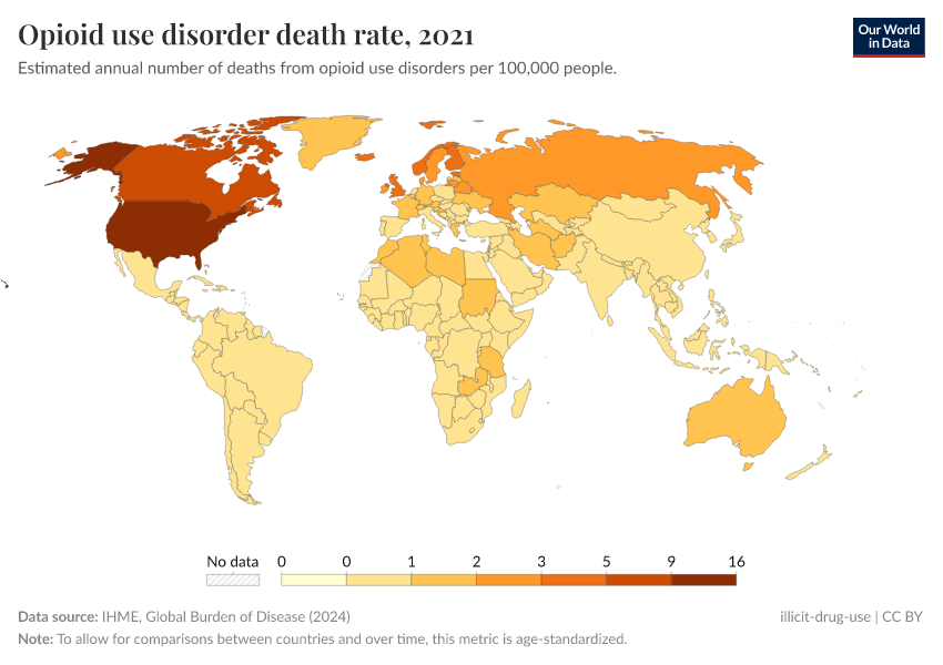 IHME, Global Burden of Disease (2024) – with minor processing by Our World in Data. “Opioid use disorder death rate” [dataset]. IHME, Global Burden of Disease, “Global Burden of Disease - Deaths and DALYs” [original data]. Retrieved March 28, 2025 from https://fix-button-icon-margin.owid.pages.dev/grapher/death-rate-from-opioid-use