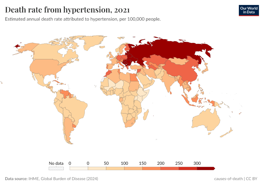 IHME, Global Burden of Disease (2024) – with minor processing by Our World in Data. “Death rate from hypertension” [dataset]. IHME, Global Burden of Disease, “Global Burden of Disease - Risk Factors” [original data]. Retrieved March 28, 2025 from https://fix-button-icon-margin.owid.pages.dev/grapher/death-rates-from-high-blood-pressure-gbd