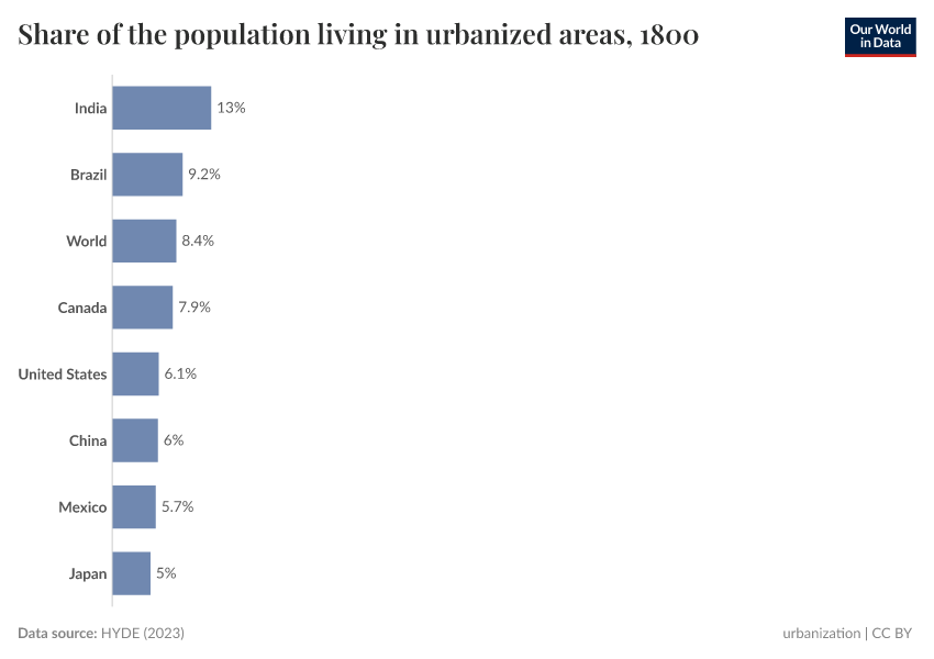 HYDE (2023) – with minor processing by Our World in Data. “Share of the population living in urbanized areas” [dataset]. PBL Netherlands Environmental Assessment Agency, “History Database of the Global Environment 3.3” [original data]. Retrieved March 28, 2025 from https://fix-button-icon-margin.owid.pages.dev/grapher/long-term-urban-population-region