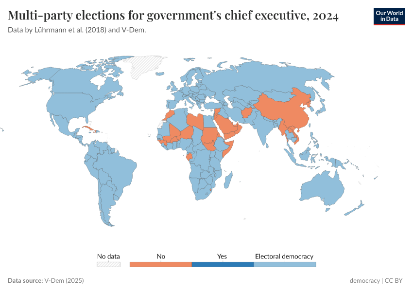 “Data Page: Multi-party elections for government's chief executive”, part of the following publication: Bastian Herre, Lucas Rodés-Guirao and Esteban Ortiz-Ospina (2013) - “Democracy”. Data adapted from V-Dem. Retrieved from https://fix-button-icon-margin.owid.pages.dev/grapher/multi-party-elections-hoe-row [online resource]How to cite this data