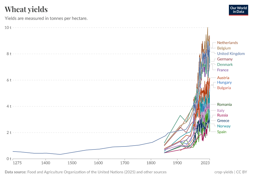 Food and Agriculture Organization of the United Nations (2025); Broadberry et al. (2015); Brassley (2000); Bayliss-Smith & Wanmali (1984) – with major processing by Our World in Data. “Wheat yields” [dataset]. Food and Agriculture Organization of the United Nations, “Production: Crops and livestock products”; Broadberry et al., “Long-term crop yields in UK”; Brassley, “Long-term crop yields in UK”; Bayliss-Smith & Wanmali, “Understanding Green Revolutions” [original data]. Retrieved March 28, 2025 from https://fix-button-icon-margin.owid.pages.dev/grapher/wheat-yields